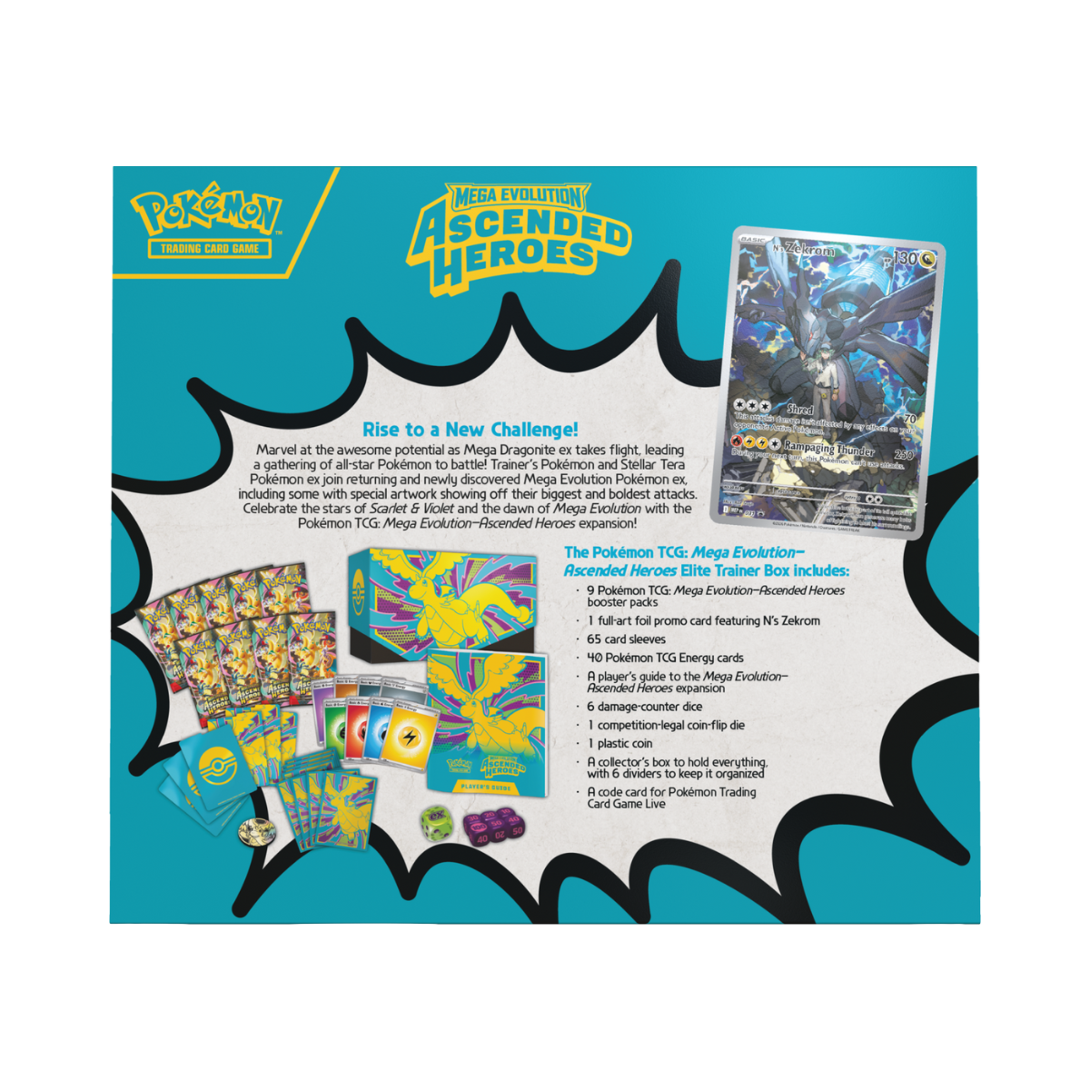 W zestawie znajdziesz aż 9 boosterów, które dają realną szansę na trafienie kart Pokémon ex, Mega Evolution ex, kart Full Art oraz innych rzadkich i pożądanych kart z dodatku Mega Evolution – Ascended Heroes. Całość uzupełnia ekskluzywna karta promo full-art foil – N’s Zekrom, stanowiąca prawdziwą perełkę kolekcjonerską.